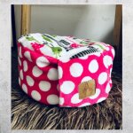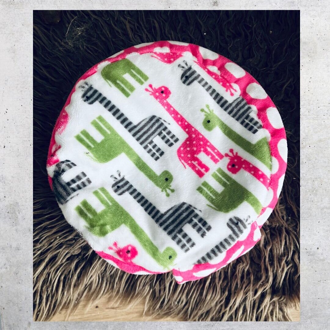 Mein liebevoll handgefertigtes Kindersitzkissen ist ein fröhlicher Hingucker für Kinderzimmer: es kombiniert ein farbenfrohes Giraffen-Design in Pink und grün mit einer Seitenfläche in kräftigem Pink, veriziert mit großen weißen Punkten.