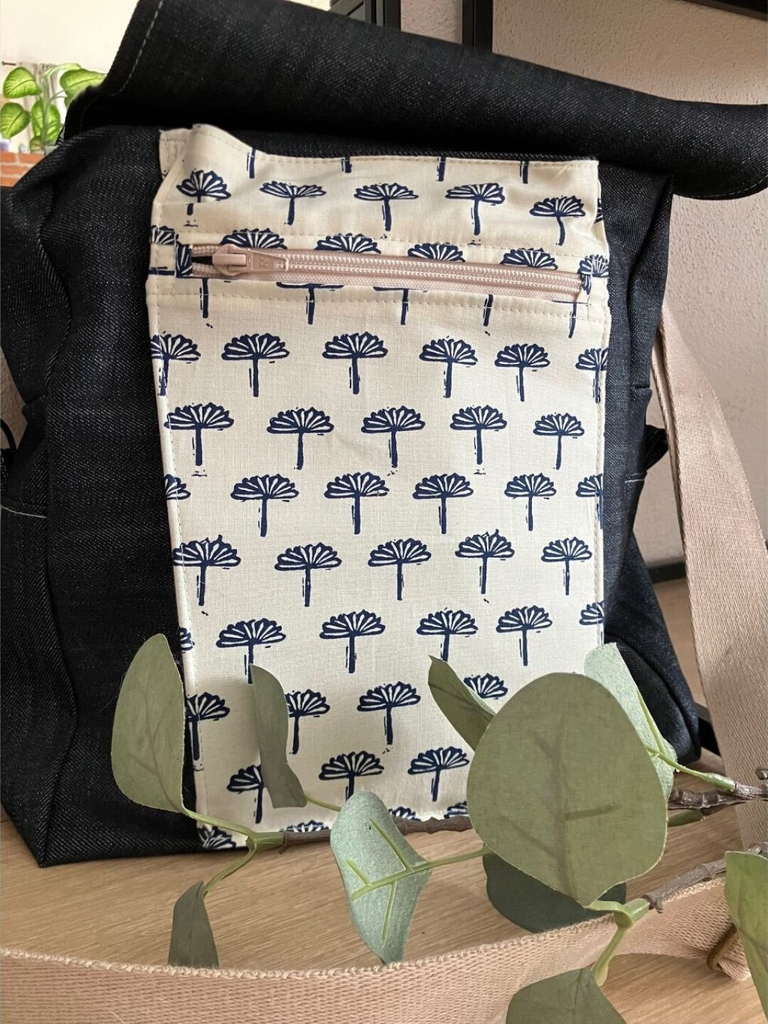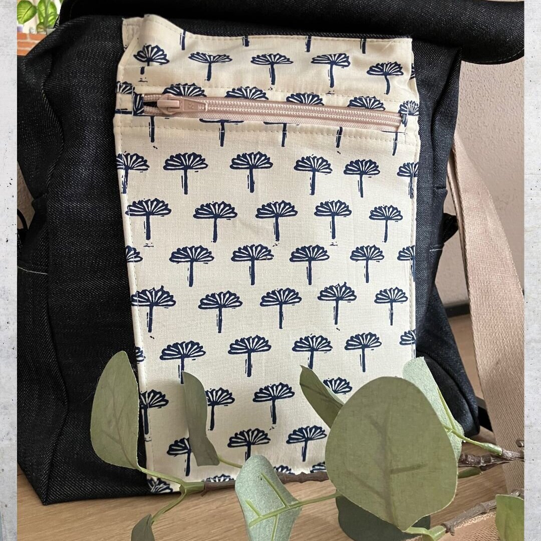 Farbe: Ecrufarben mit dunkelblauen Aufdruck kombiniert mit Jeansstoff